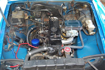 I finally got the new Weber DGV Carburetor installed together with a peco header and exhaust. The whole thing was installed by Flying Circus English Cars in Durham. First the Carb. The DGV is the manual choke version. (DAGV is water and DEGV electric). The carb is a twin barrel downdraft with the 32mm barrel opening at low throttle and the 36 opening at higher throttle. You get better gas mileage and still nice performance when you need it. The carb came with a new header as well. Here are some pics of the set up.